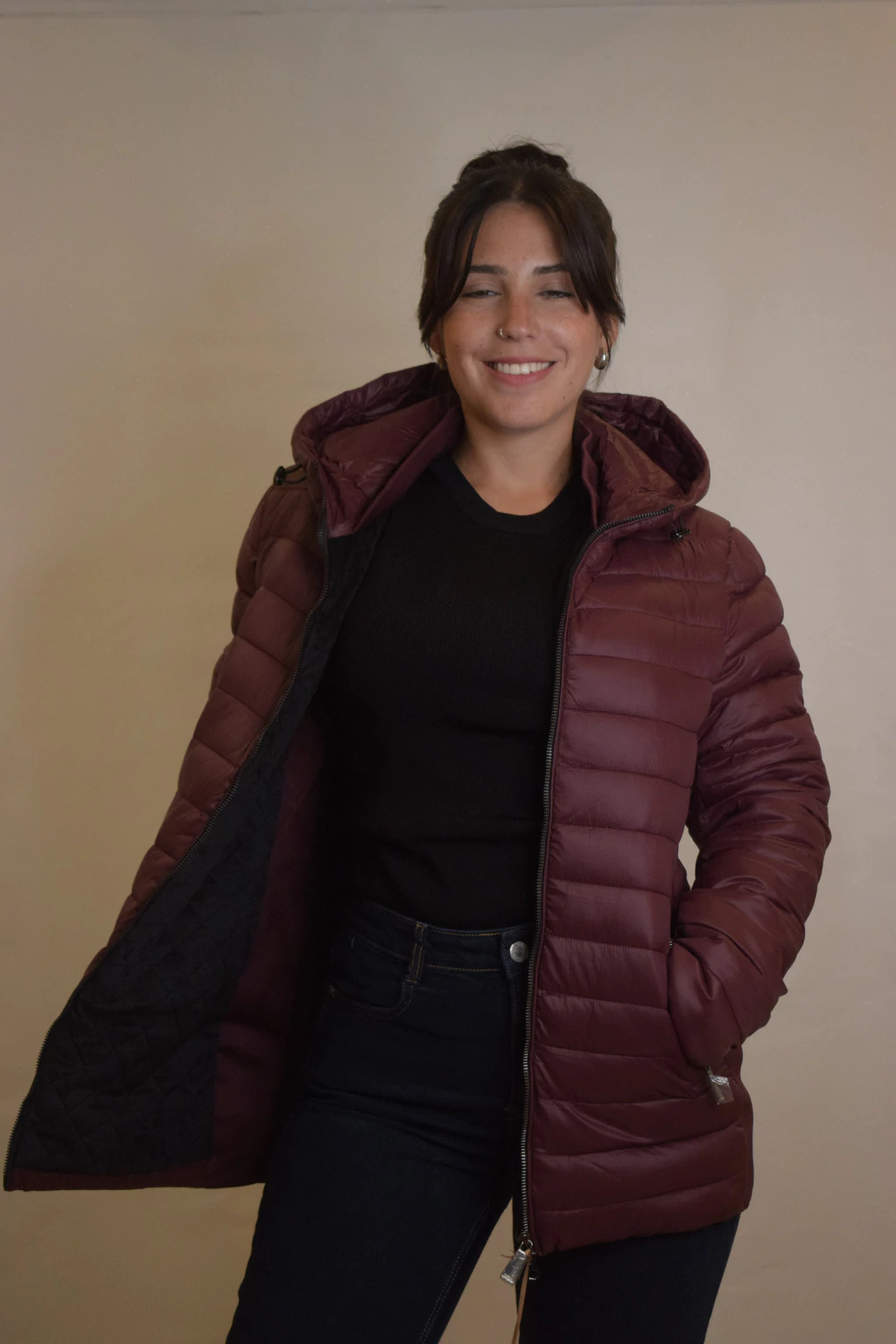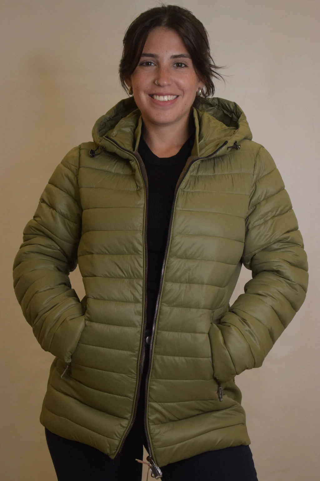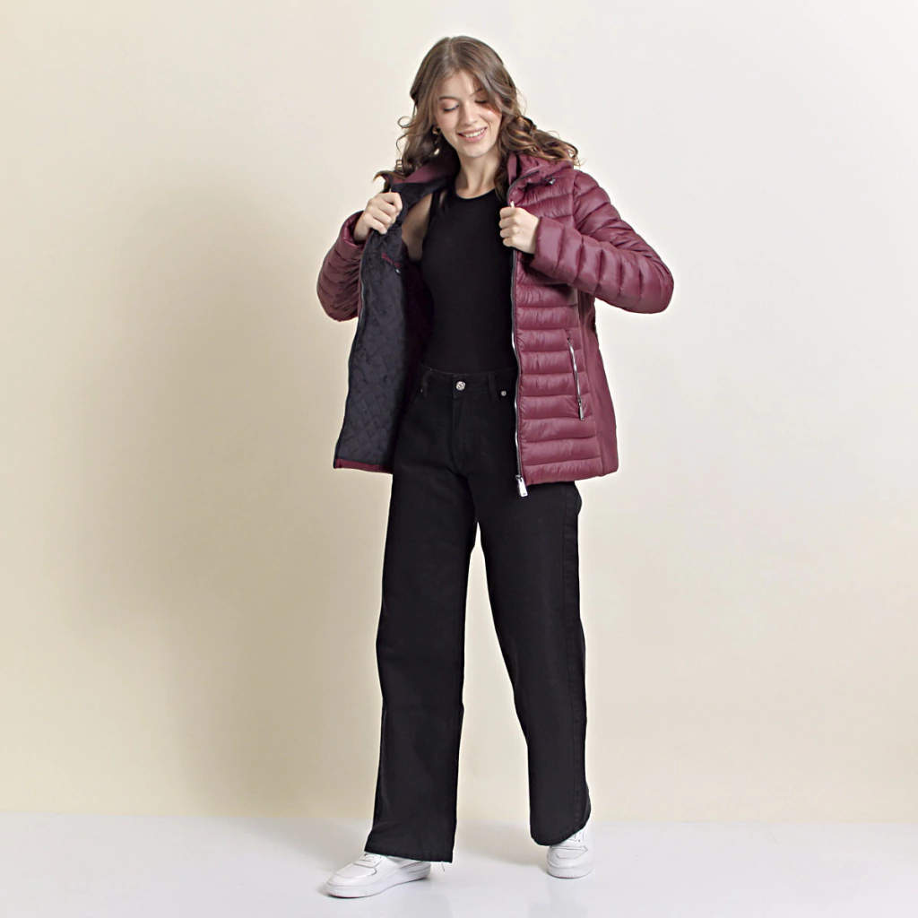 La Campera Antonella es un modelo corto con relleno de pluma sintética. Incorpora una capucha integrada, dos bolsillos externos y dos internos. Sus costados son elastizados y cuenta con felpa en el interior, brindando mayor abrigo
