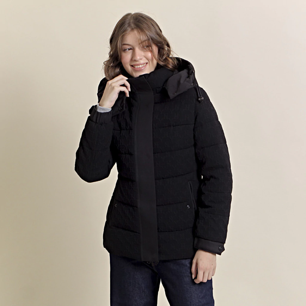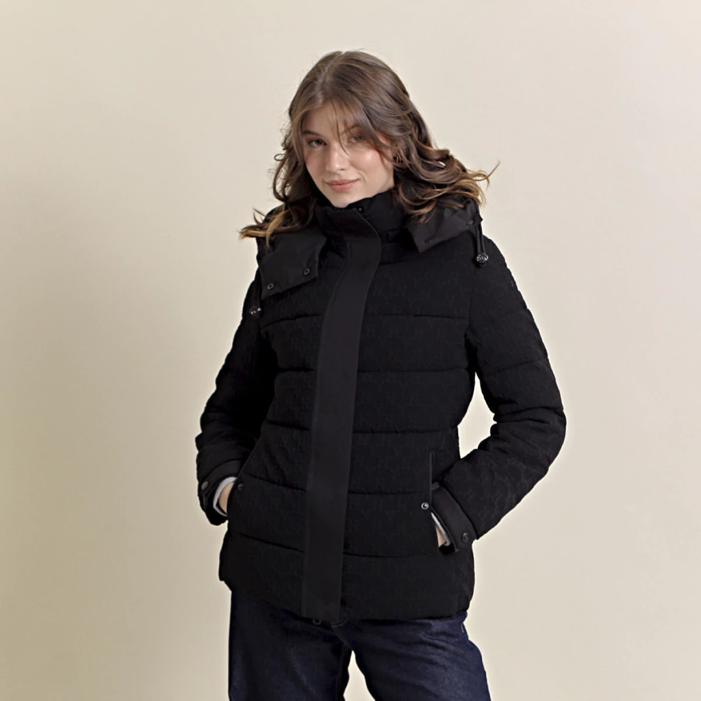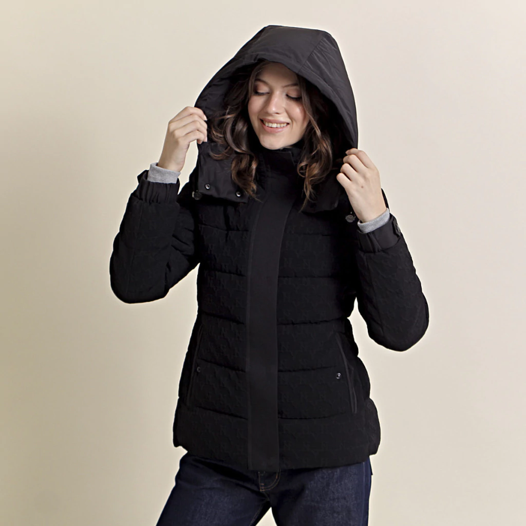 La Campera Delfina es una prenda corta y elegante, con tela en relieve. Cuenta con capucha desmontable, ajuste, dos bolsillos internos y externos. Su relleno de pluma sintética la hace ideal para el invierno.