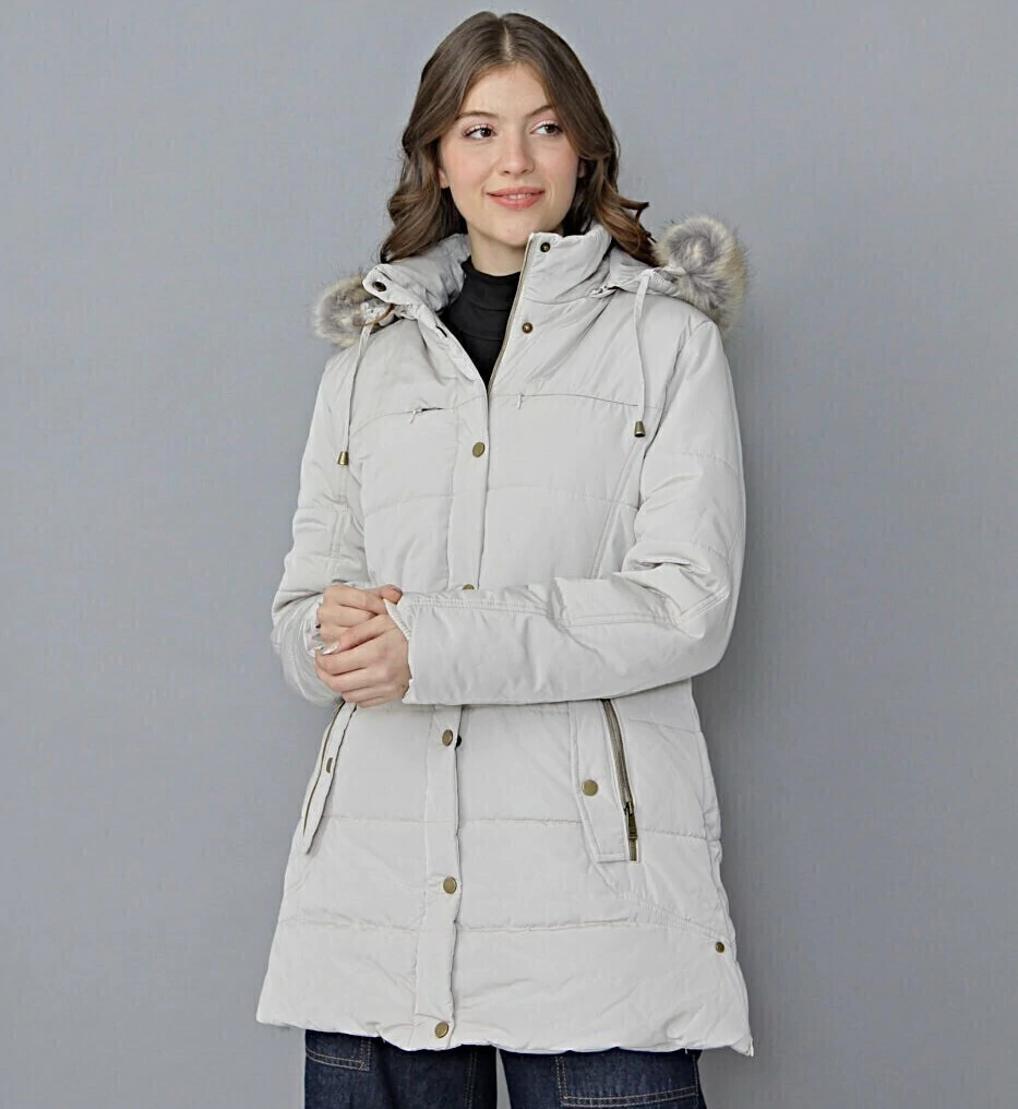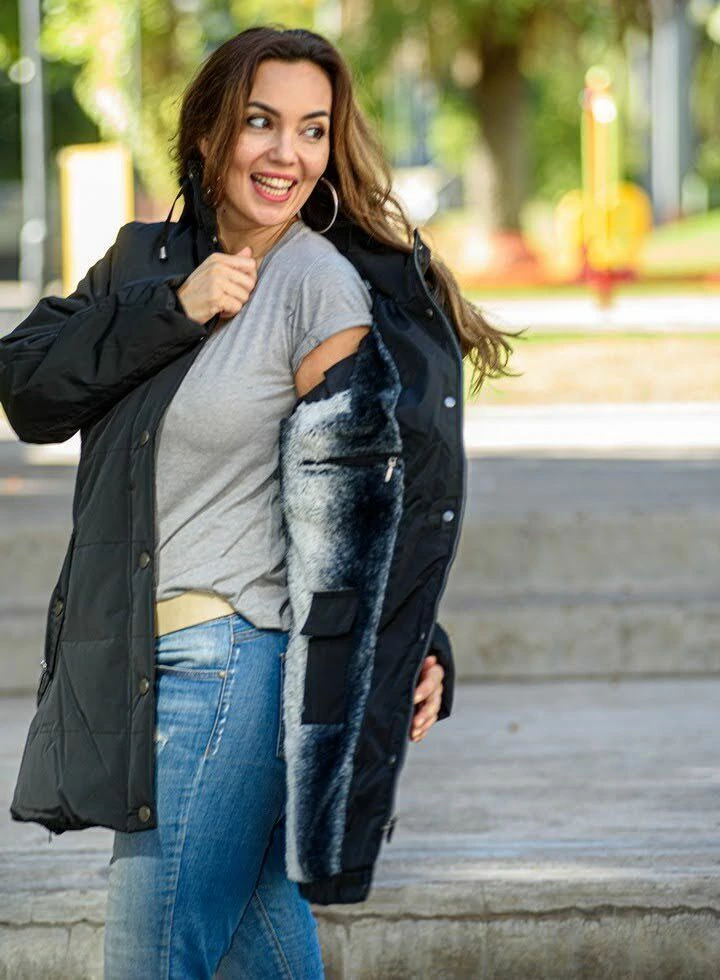 Campera larga piel fantasia interior y en la capucha bolsillos varios.