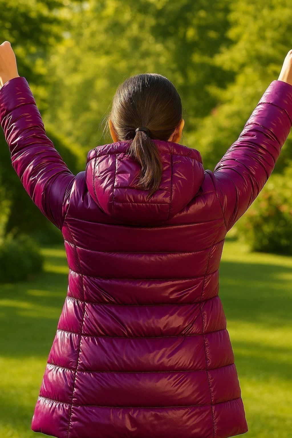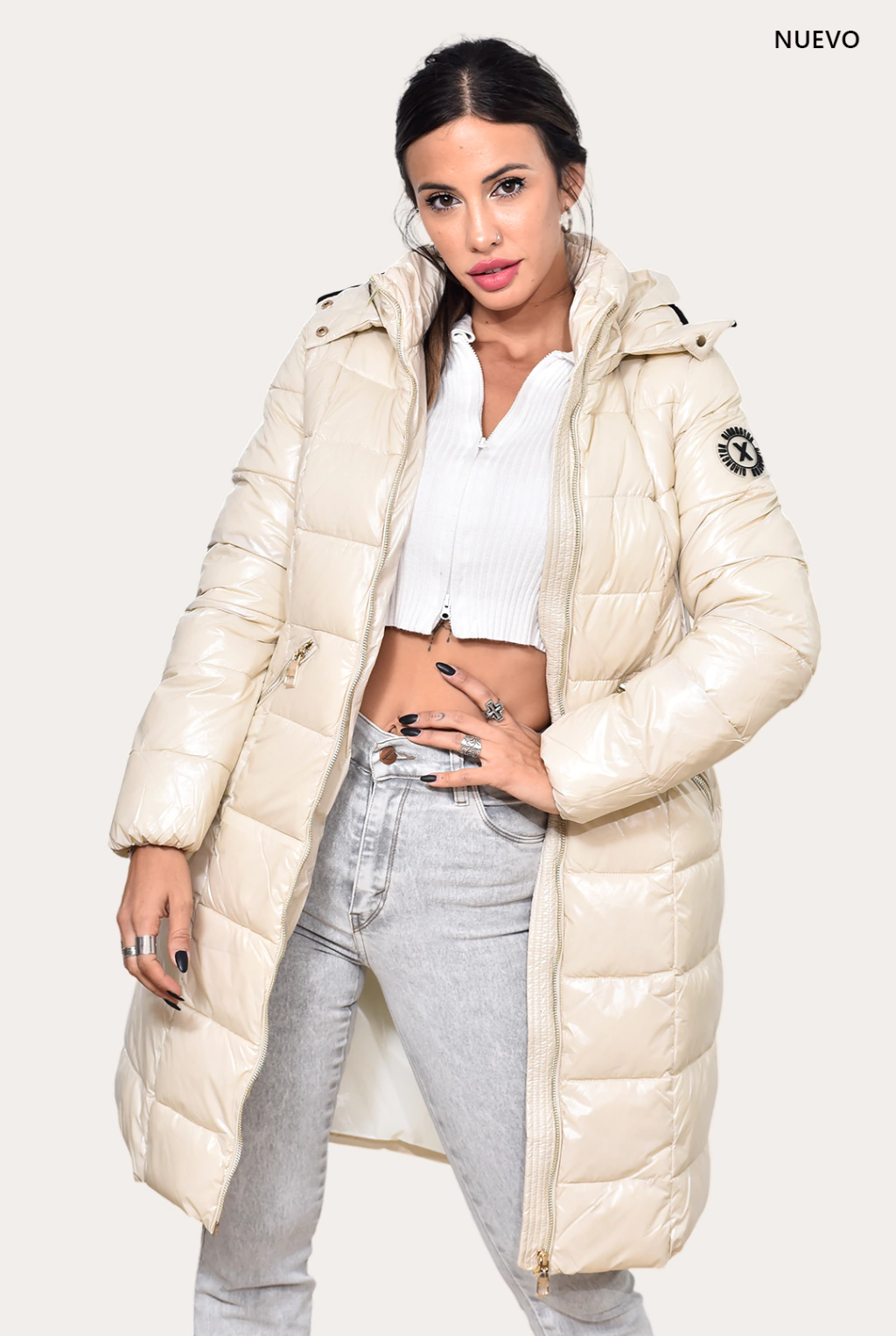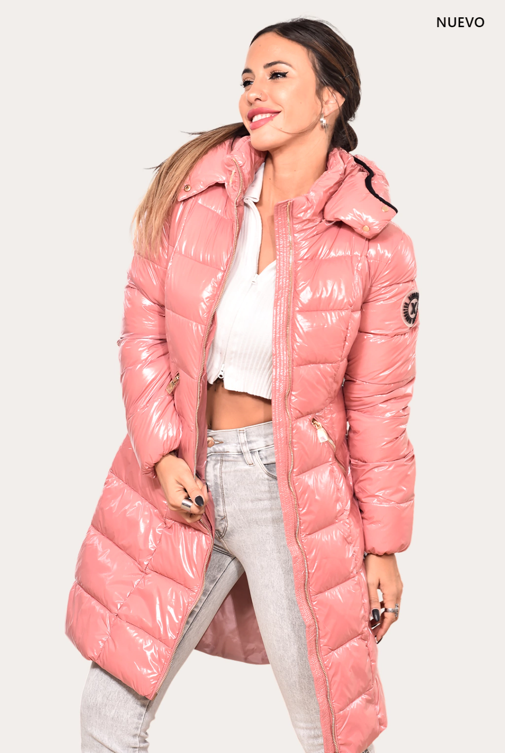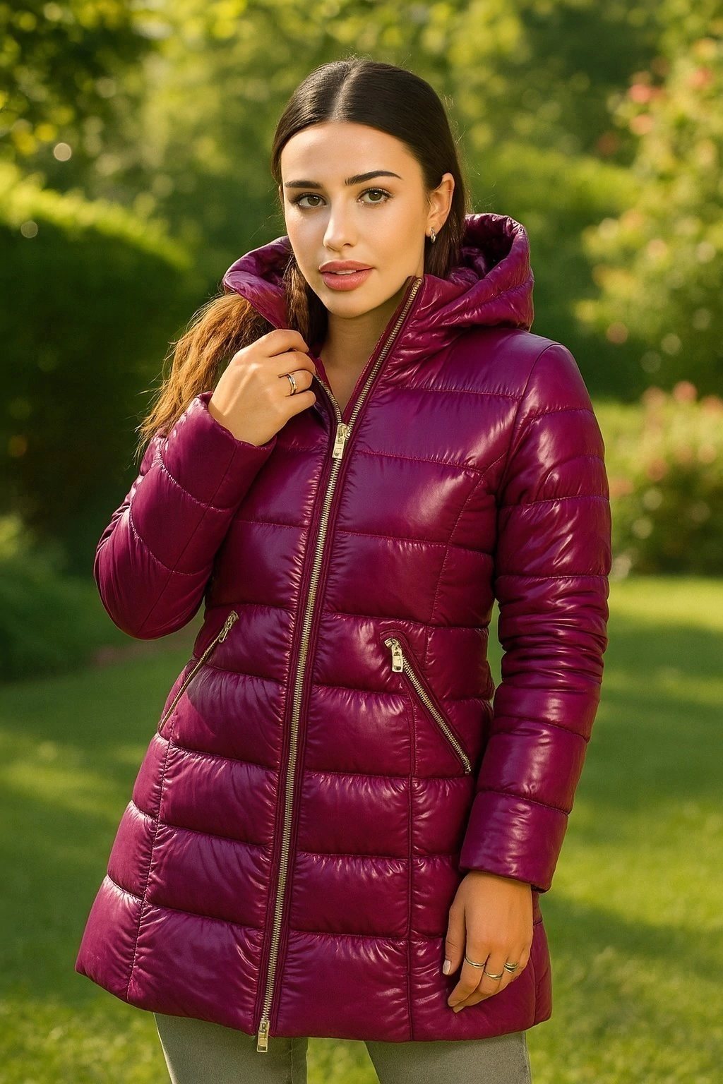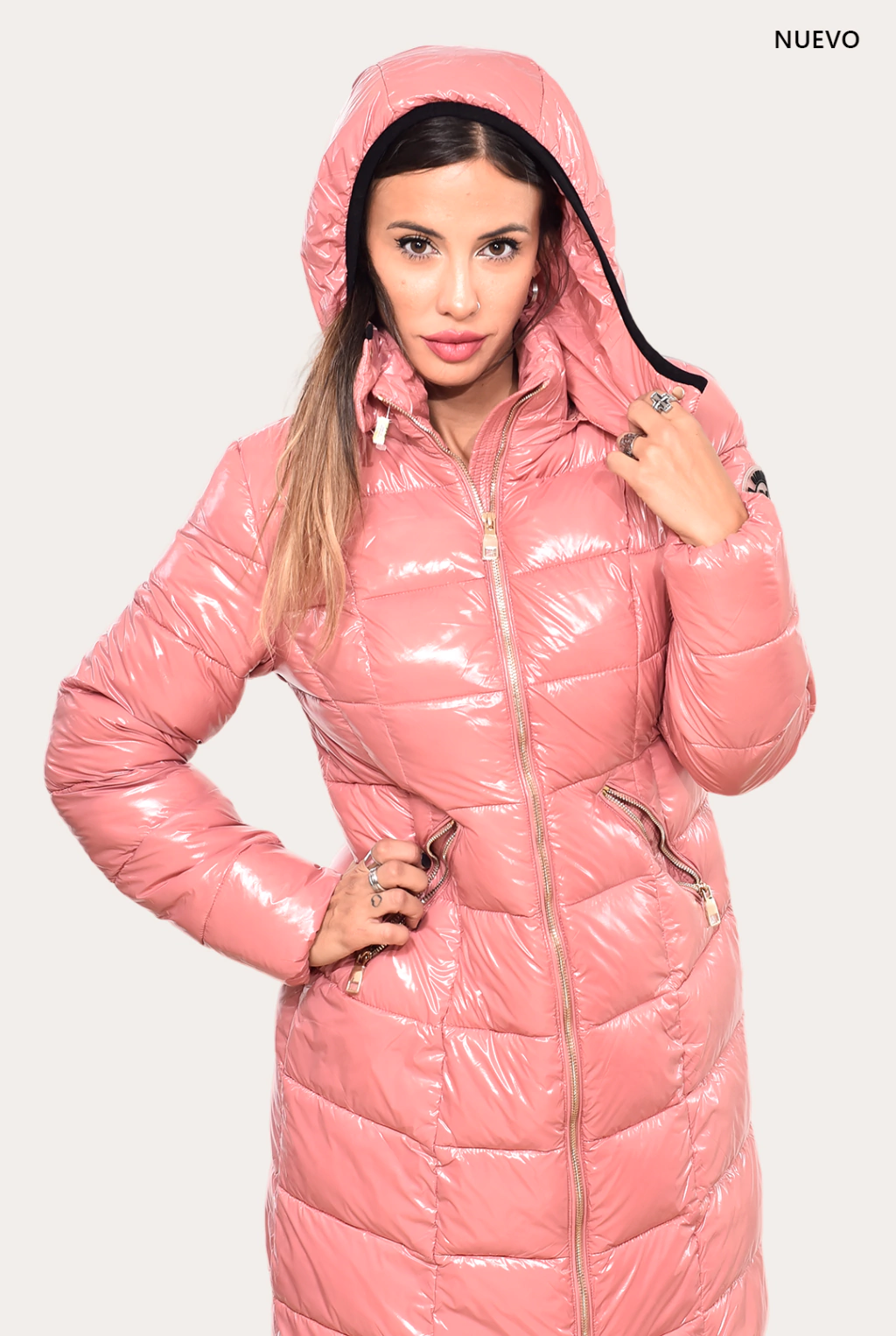Campera brillosa, larga. Rellena de dupont, simil pluma antialergica. Posee cierre doble guía, bolsillos internos y externos. Capucha desmontable.