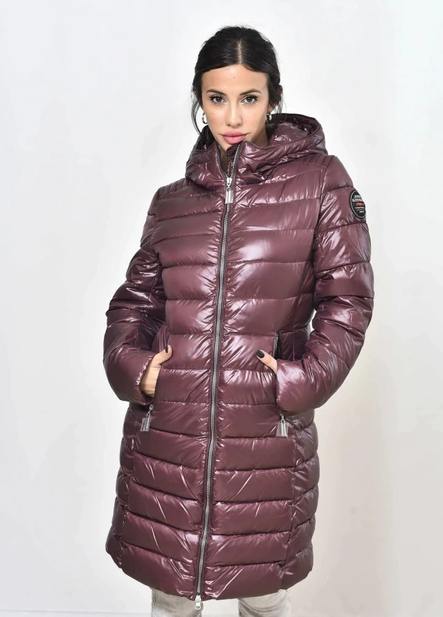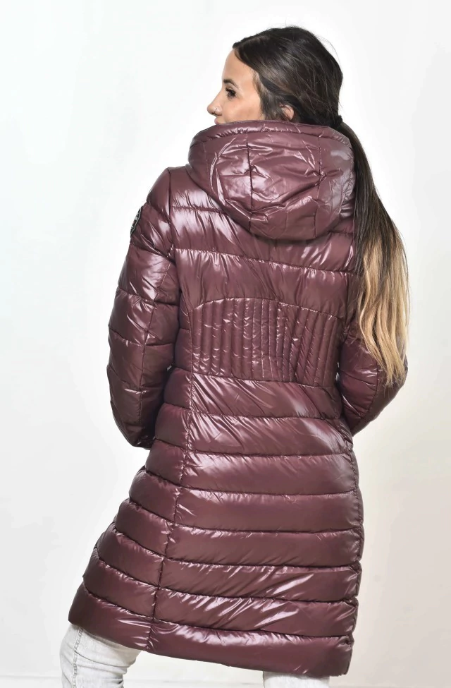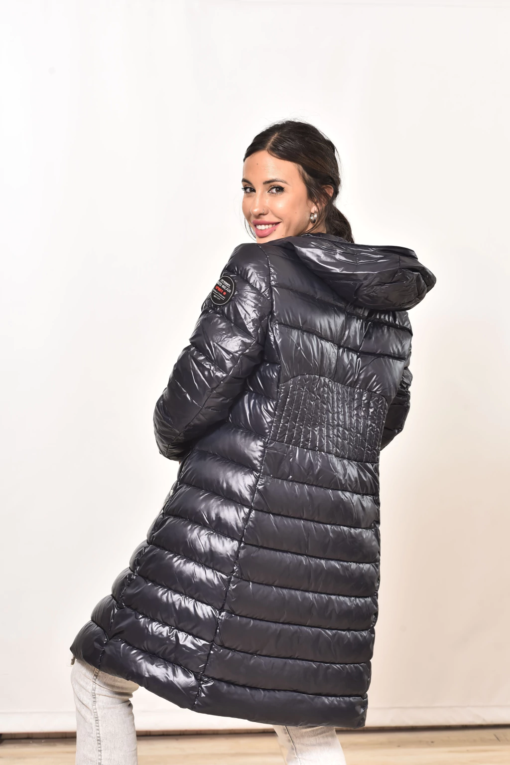 Moderna campera con relleno similar pluma DuPont antialérgico que ofrece calidez y ligereza. Diseño con frunce trasero estilizante y cierre doble para ajuste personalizado.