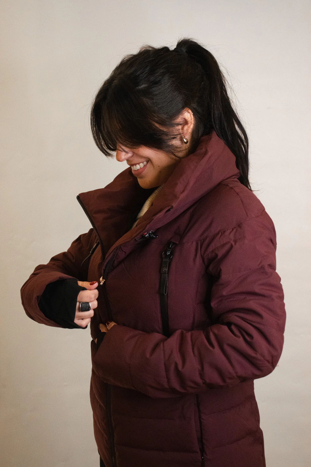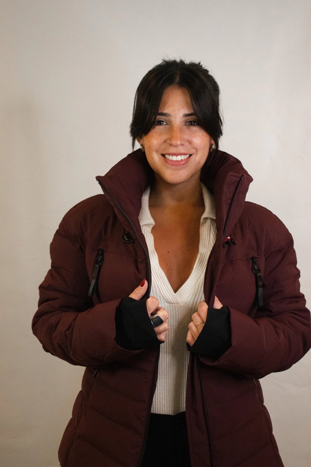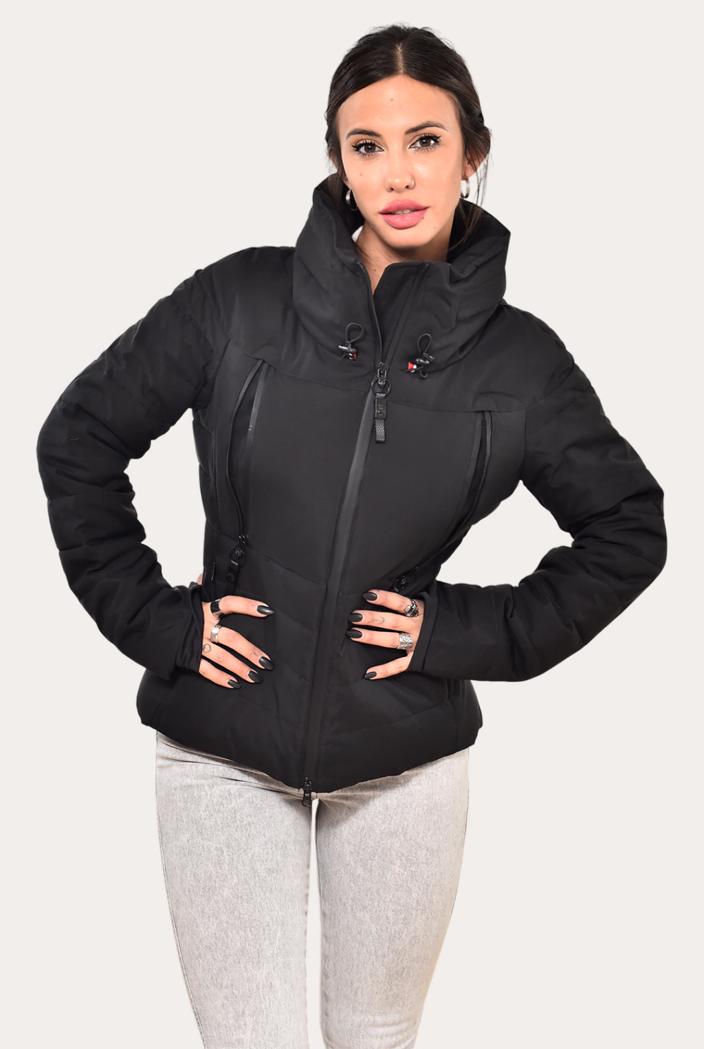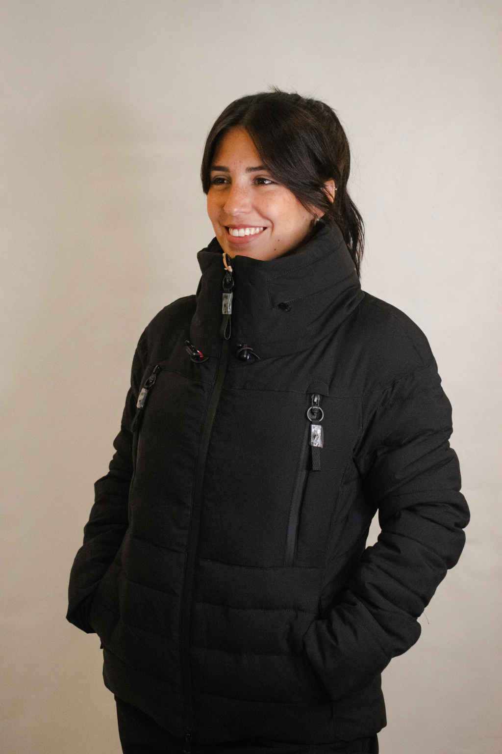 La Campera Naomi es una prenda corta y entallada, con capucha integrada y relleno de pluma sintética. Cuenta con un bolsillo interno y cuatro externos, diseñada para adaptarse a distintas siluetas.